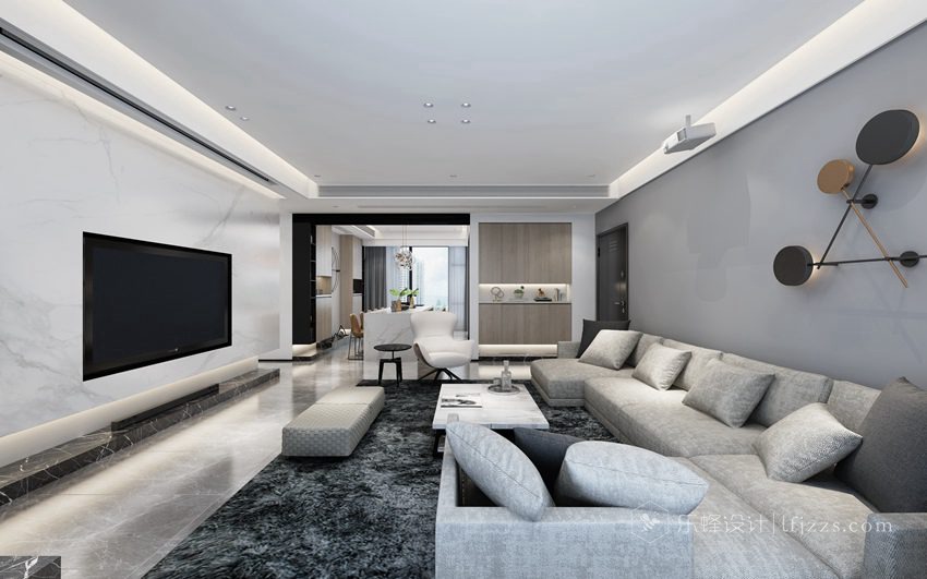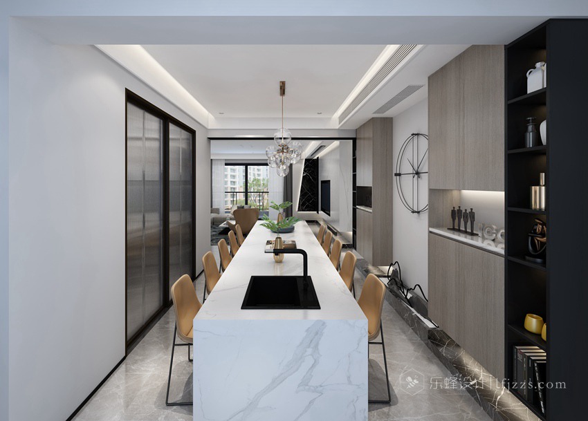 運用簡潔而非對稱的直線和不銹鋼線條來塑造空間的立體感。色彩簡約,空間以白色為主基調(diào),摒棄傳統(tǒng)的吊燈,使用點光源的筒燈,使燈光更有層次感,整個空間的燈光也更柔和。