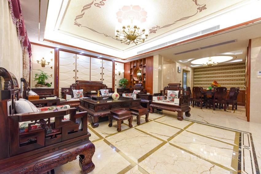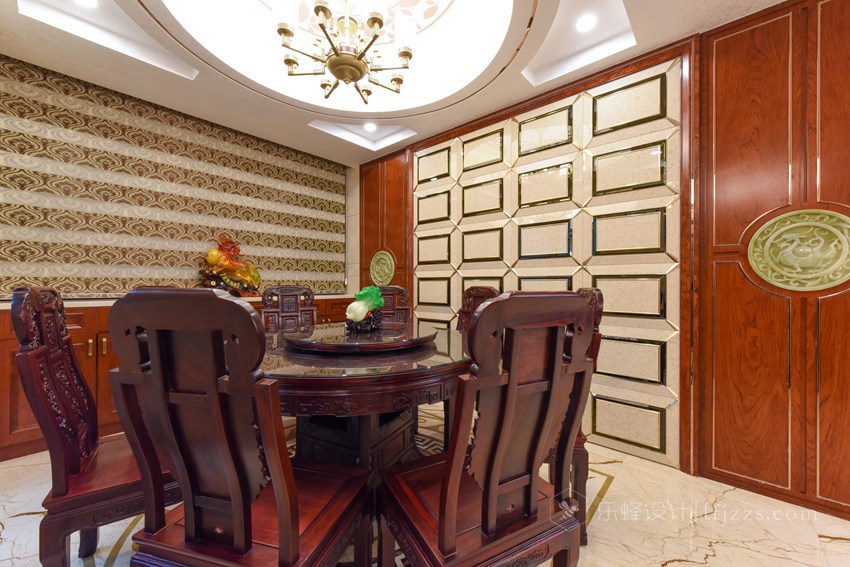 蔡先生家的設計中式元素為主,家人對中式文化的底蘊有很高的向往。案例中客廳餐廳入戶合理分區(qū),形成通透、共享的室內(nèi)格局,實木線條元素穿梭于整個空間,餐廳及過道中造型背景墻面運用玉的元素點綴重點使整個氛圍添加活力。墻面上抽象的現(xiàn)代畫作極富時尚氣息。整體風格以簡約為原則,適當?shù)牧Ⅲw結構上鑲飾黑色鏡面不銹鋼,也流露出金屬的本色硬朗的色彩,及完成了“點”的作用;石材的貫穿裝飾完美的體現(xiàn)了裝飾風格的主體文化。天花的裝飾燈槽突破了常規(guī)繁鎖吊頂?shù)淖鞣ǎ宫F(xiàn)了客廳天花的立體空間,內(nèi)藏燈帶,印射出來的不是眩眼的光源,而是柔和溫馨的二次間接光源。