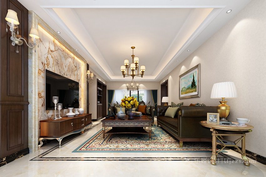 本案為美式風(fēng)格設(shè)計(jì),方案以整體空間更加開闊為主,背景墻面裝飾采用了經(jīng)典的壁爐造型,突出整個(gè)空間的氛圍感而其他地方則選擇乳膠漆為主,在特定位置點(diǎn)綴不同的顏色,配上美式的家具和燈具,突出風(fēng)格氛圍。