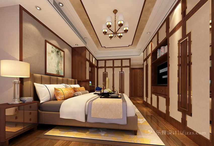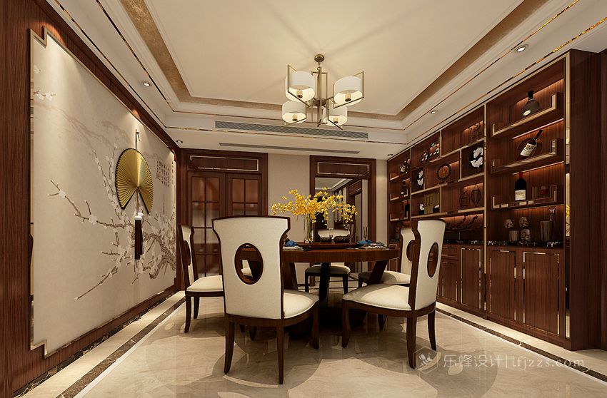 本案整體風格是用中式而穩(wěn)重的手法演繹大氣精神,同時又不失高尚古典的品味生活。將現(xiàn)代和傳統(tǒng)元素結(jié)合一起,以現(xiàn)代人的審美打造古典韻味的事物,運用簡約大氣的手法,為業(yè)主營造一處經(jīng)典、氣派的大居所,體現(xiàn)出主人優(yōu)雅舒適的生活態(tài)度。在整體空間中和諧基調(diào)上彰顯出典雅的氣勢,軟裝和硬裝上的中式元素的運用,成就了本案的精髓與靈魂。色彩以深色穩(wěn)重為主,中式家具色彩一般比較深,這樣整個居室色彩才能協(xié)調(diào)。這樣也可以更好的表現(xiàn)中式家具的內(nèi)含。