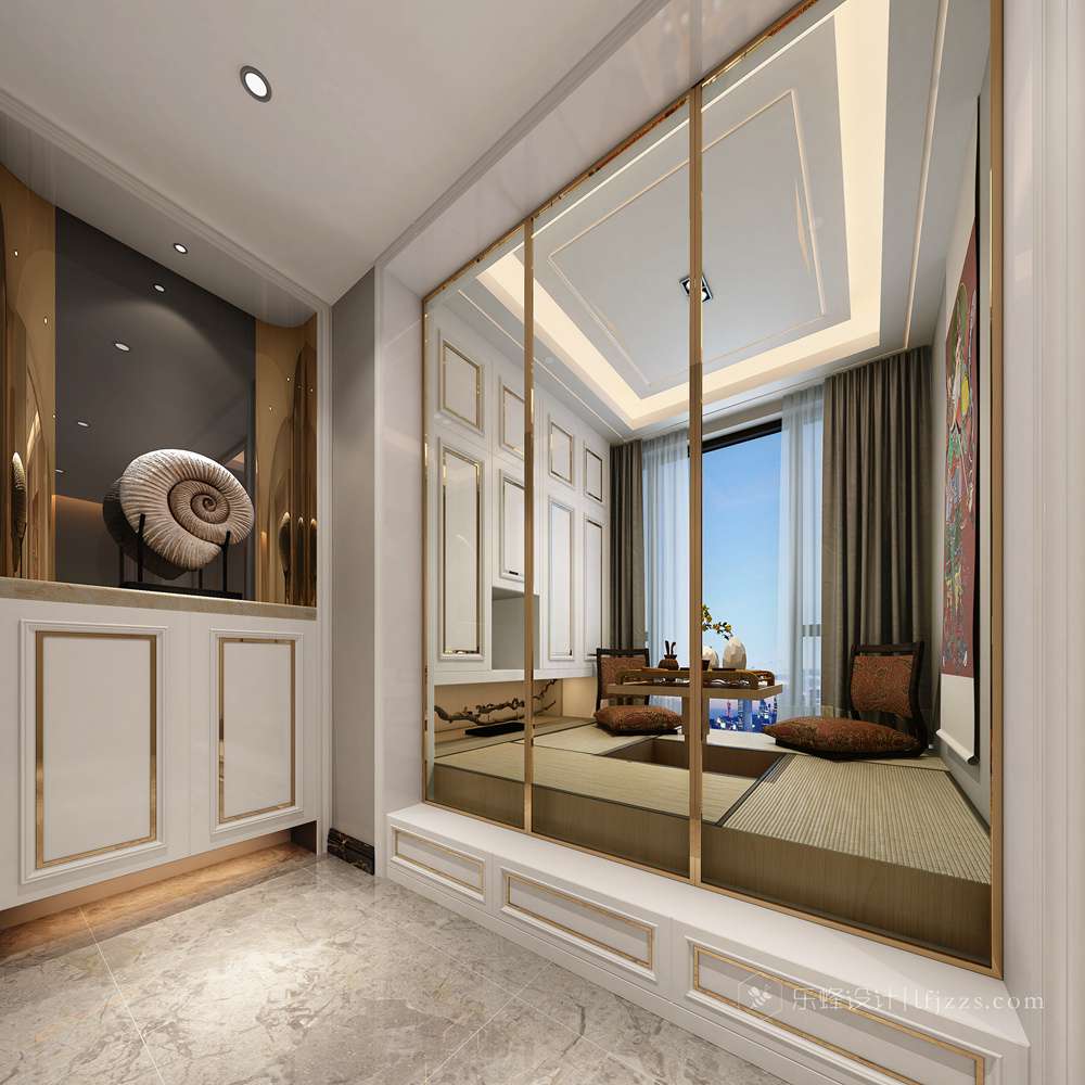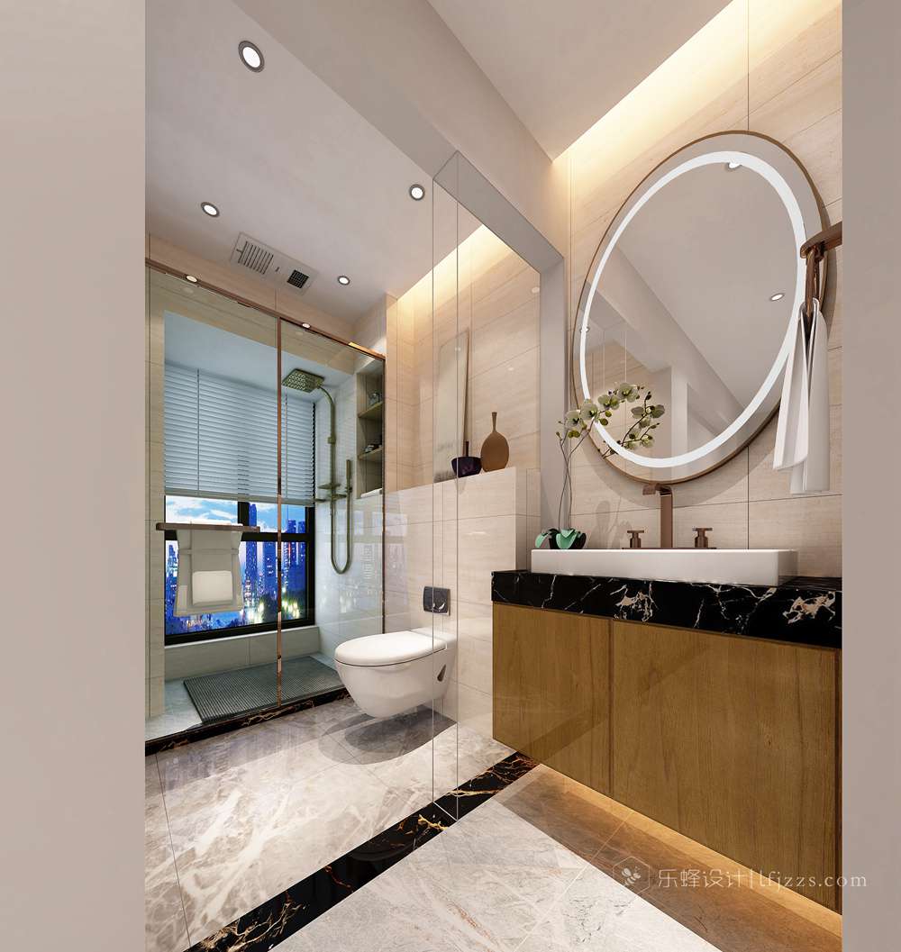 公衛(wèi)設(shè)置了兩個玻璃推拉門,將整個功能區(qū)干濕分離,保證了這個奢華空間在觸覺與視覺上的干爽。進(jìn)行干濕分離的話,也有助于提高公共區(qū)域的使用效率。