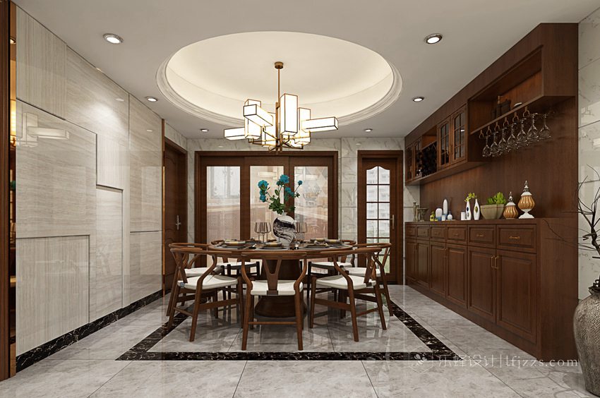 8人實木大圓桌的溫潤造型,與天花處的圓形吊頂遙相呼應?!皥A潤”是作為禮儀之邦的中國人在待人處事時亙古不變的真理,把處事之道融進家宅,展現(xiàn)家主的胸懷,也只有中式風格能擔此重任。