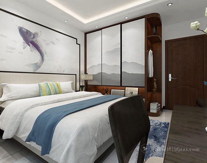 “魚”衍生出來的美好意象,讓人們想把它請進家中,床頭背景的游魚墻布即是很好的證明。