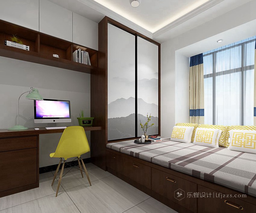 主臥與入戶同處一側(cè),開窗朝南帶來極佳的采光,給空間做造型奠定了良好的基底。設計師在主臥臨窗處用人造窗臺石做了一個飄窗,滿足業(yè)主閑時在這里讀書看報的生活習慣。