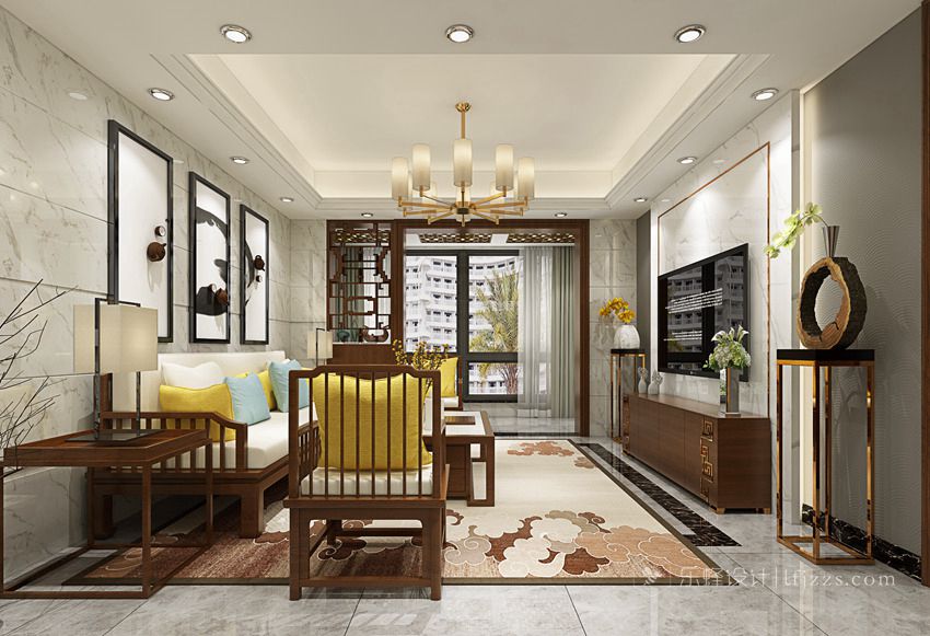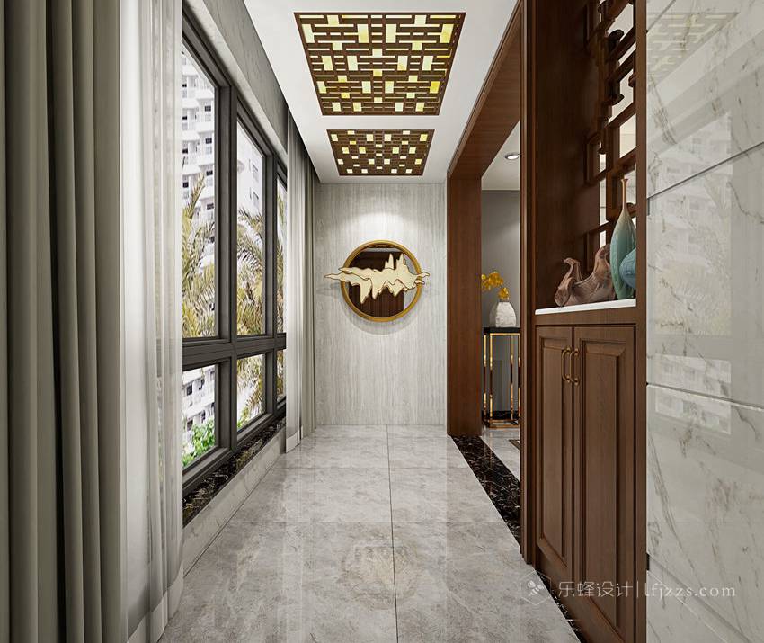 入戶開窗朝南,保留原戶型的大落地窗可以發(fā)揮本區(qū)的采光優(yōu)勢,搭配中式裝潢,通透的空間可以很好地還原中式器具的古典氣質(zhì)。
