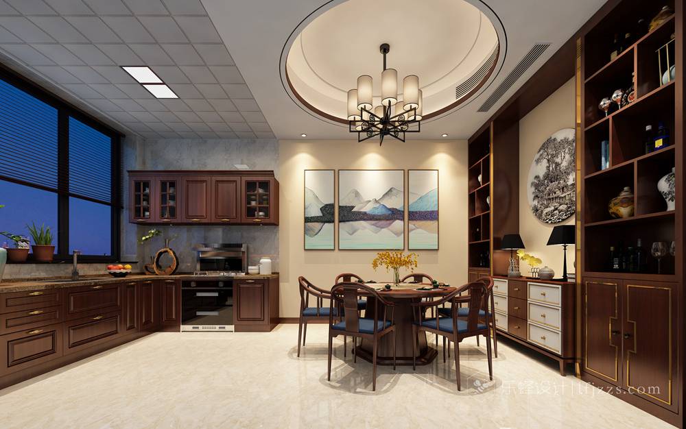 開放式餐廚區(qū)設(shè)計(jì),隱藏了兩功能區(qū)的界限,在視覺上達(dá)到了擴(kuò)大空間的效果。紅木家具是這個(gè)開放空間的聯(lián)結(jié)線,它串起了餐廳與廚房的淳樸情感。