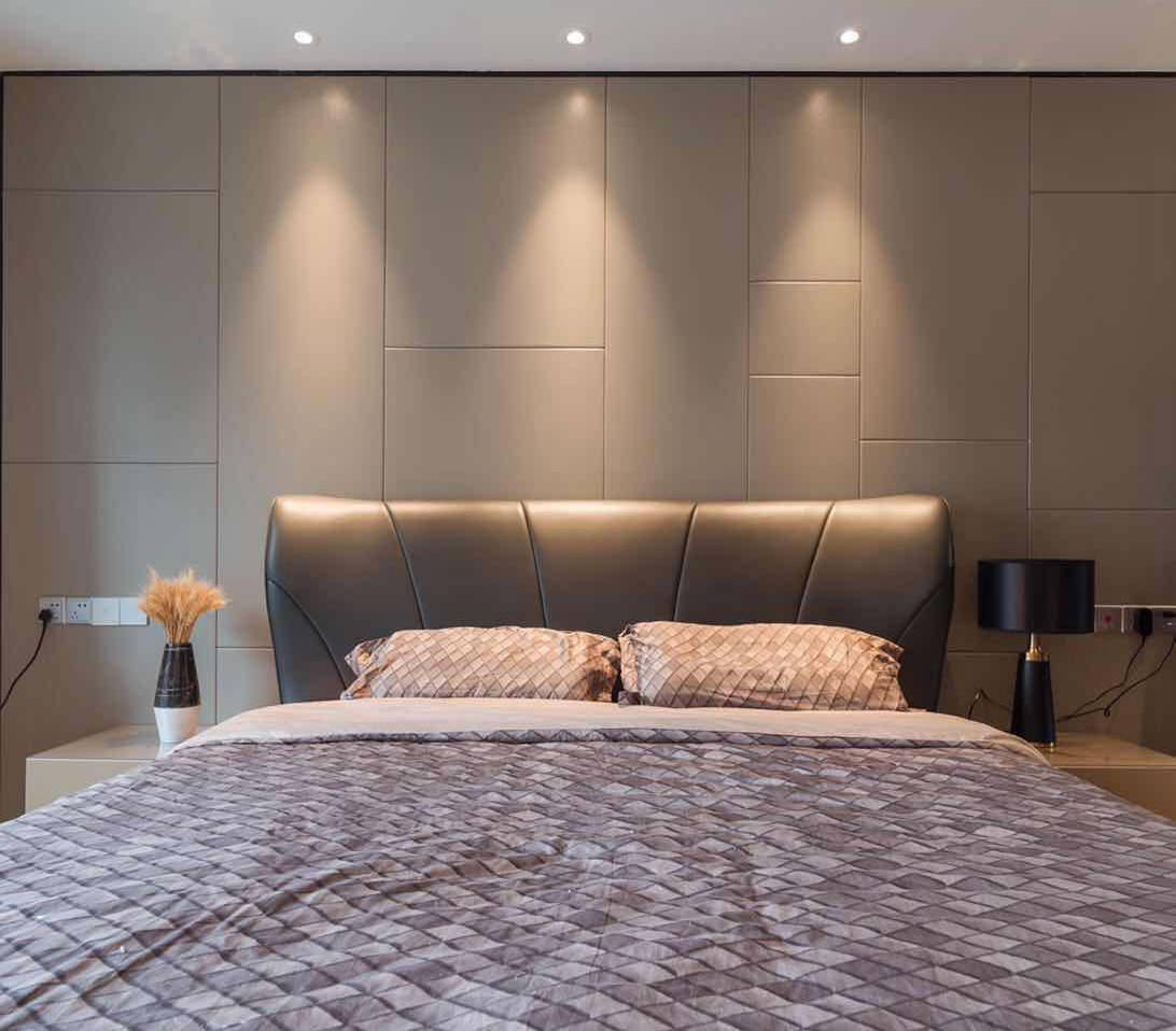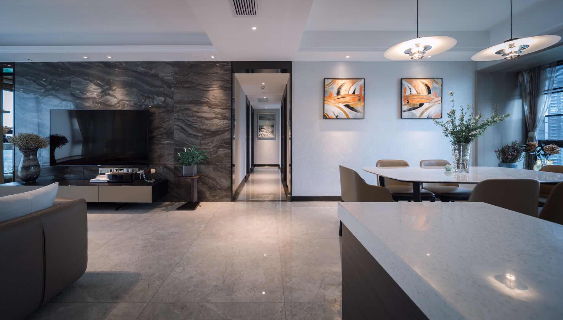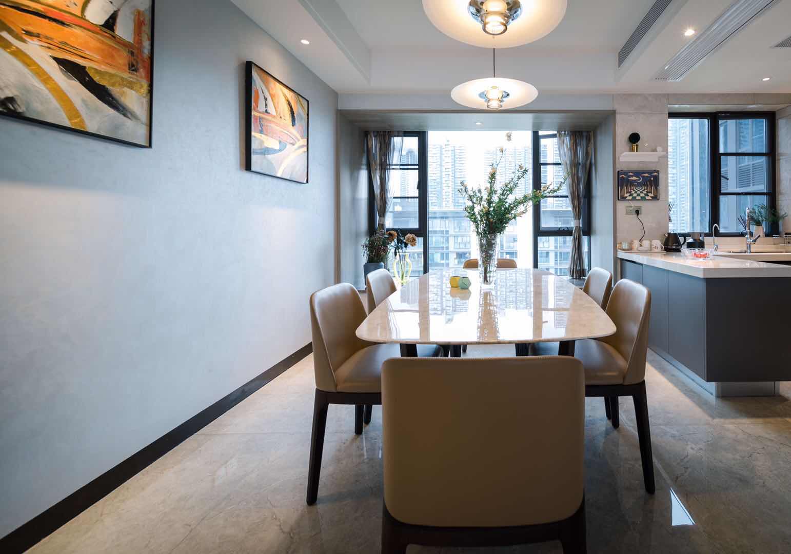 本案空間造型設(shè)計(jì)簡約流暢,運(yùn)用簡潔而非對稱的直線和不銹鋼線條來塑造空間的立體感。色彩簡約,空間以白色為主基調(diào),摒棄傳統(tǒng)的吊燈,使用點(diǎn)光源的筒燈,使燈光更有層次感,整個(gè)空間的燈光也更柔和。