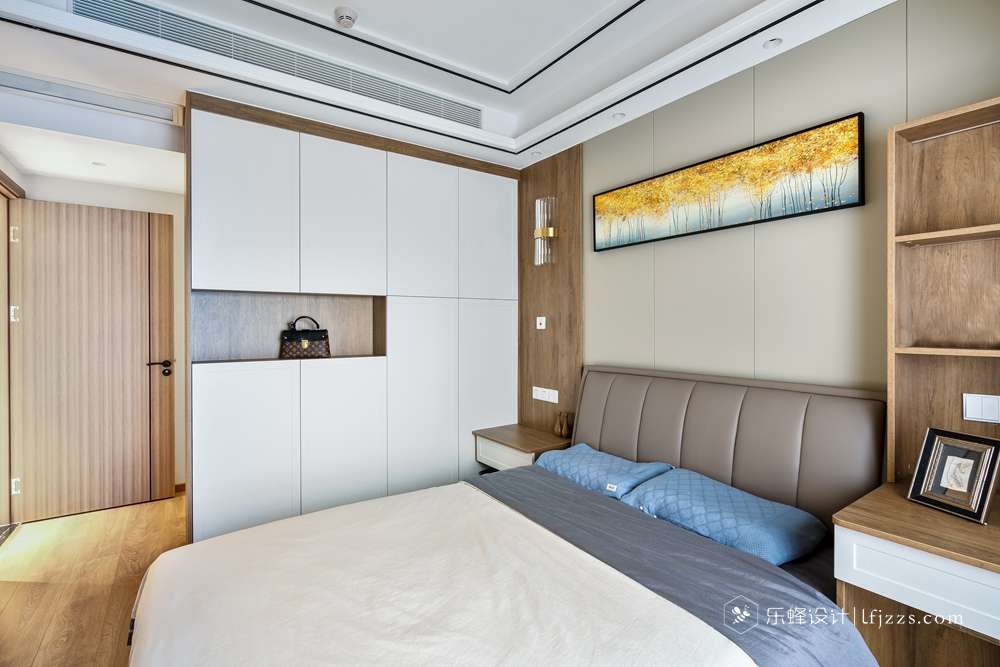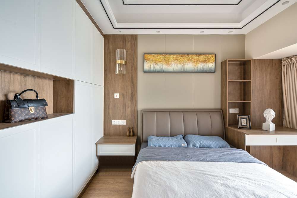 主臥放了一個(gè)1米5的床,旁邊做了一整面墻的衣柜,這樣收納也會(huì)更加的強(qiáng)大,旁邊做了一個(gè)梳妝臺(tái),平時(shí)女主人收拾梳妝的話也比較方便,上面還做了一部分的柜子,這樣一些用的東西,也可以多放一點(diǎn),拿起來也更加方便