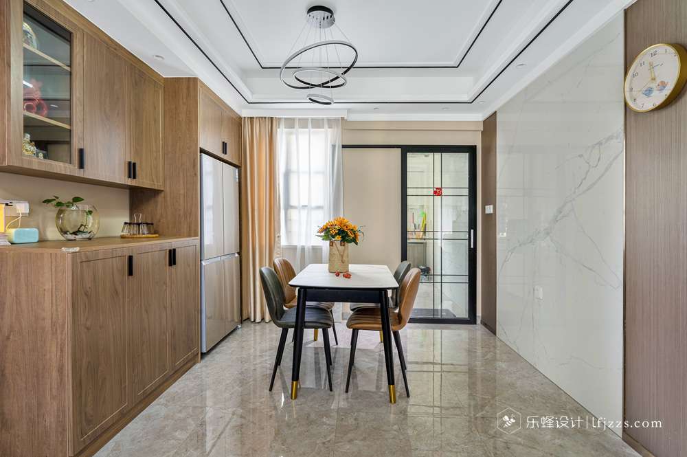 餐廳后面做了一面墻的一個(gè)柜子,這樣一些東西也方便放進(jìn)去一點(diǎn)。冰箱是做的一個(gè)嵌入式的,暗藏在柜子的里面,這樣也比較省空間和更好看