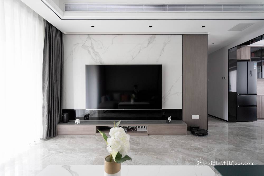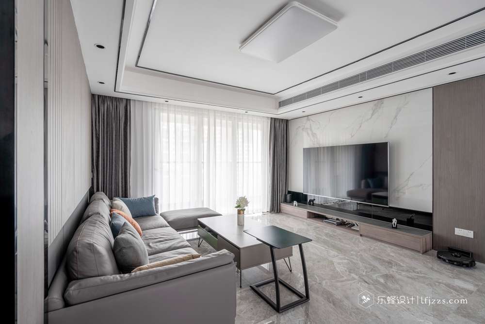 灰色花紋色的電視背景墻與硬包的搭配,從視覺拉長整體比例感?;疑嫫ど嘲l(fā)、大落地窗、白色紗簾的光感,融合成溫馨舒適的空間。