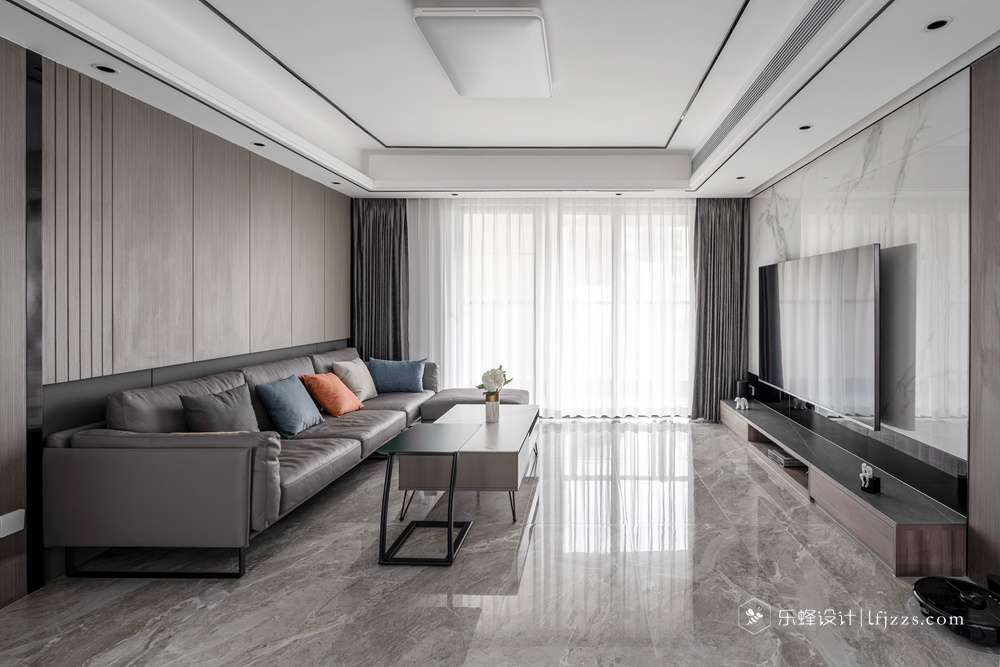 灰色花紋色的電視背景墻與硬包的搭配,從視覺拉長整體比例感。灰色真皮沙發(fā)、大落地窗、白色紗簾的光感,融合成溫馨舒適的空間。