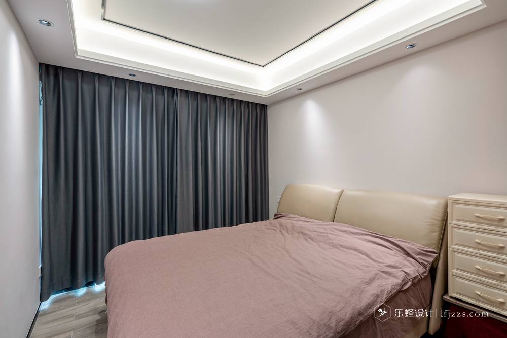 主臥采用白色調(diào)為主,燈帶、燈光搭配深色落地窗簾,用最簡潔有力的設(shè)計語言,表達(dá)出的純粹質(zhì)樸直抵人心。粉色的床單布置,也使得這個空間更加的溫馨。