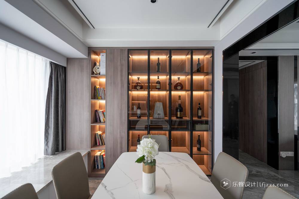 木質(zhì)感與黑色玻璃搭配成兩面不同的柜體,石材質(zhì)感地面、構(gòu)成沉穩(wěn)大氣的空間氣氛。