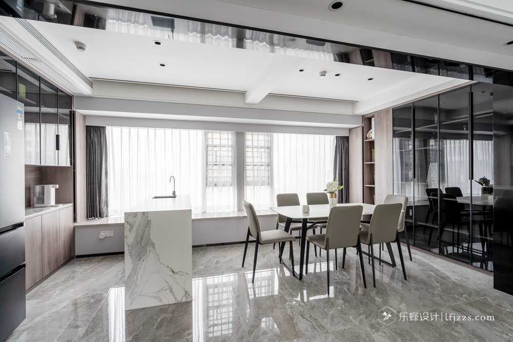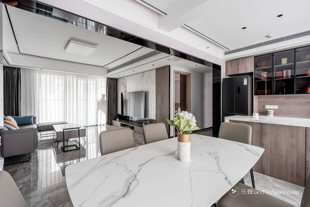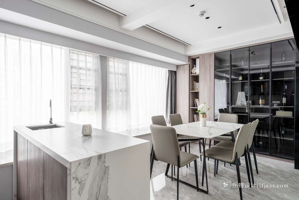 吧臺作為一個輕食臺和餐桌高低組合,組成一個方便別致的聚餐區(qū)。同時滿足少數(shù)人和多人的進(jìn)食需求。吧臺后面 做了一面柜體滿足了收納功能,還能把冰箱鑲嵌進(jìn)去,做到安全又美觀。