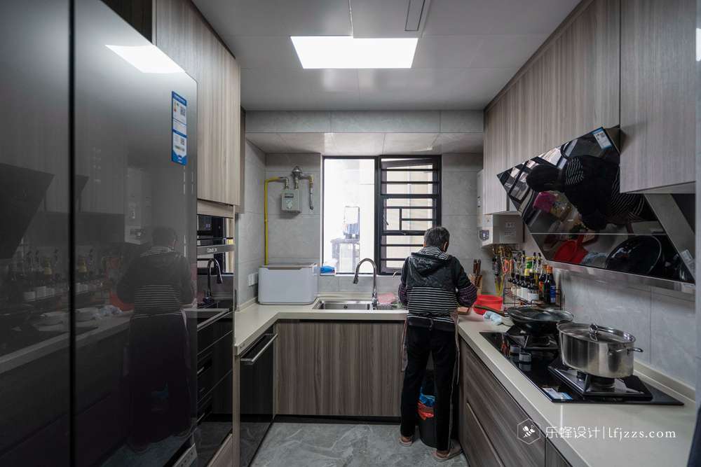U型廚房,整體采用木質(zhì)的整體衣柜搭配大理石臺面,無不透露出高雅精致氣場。