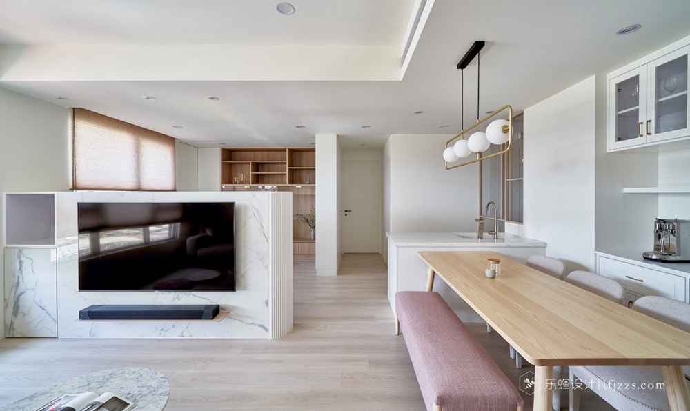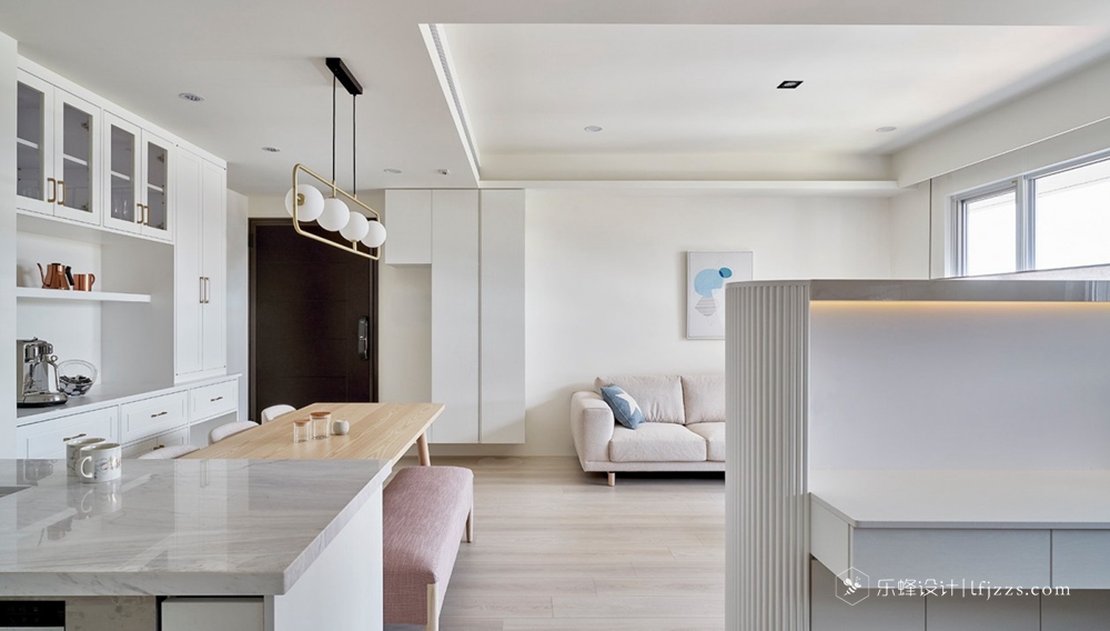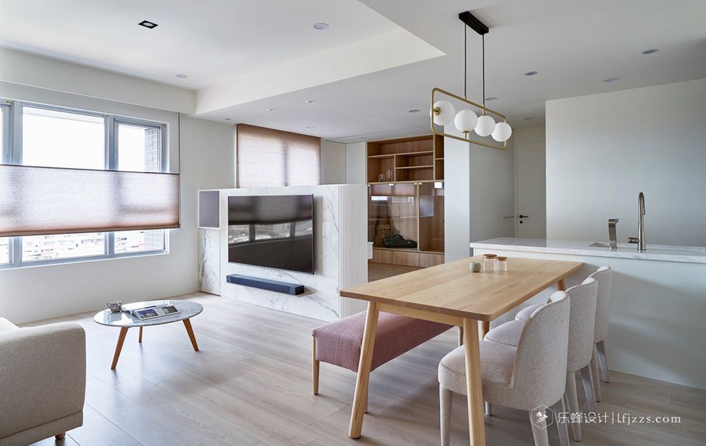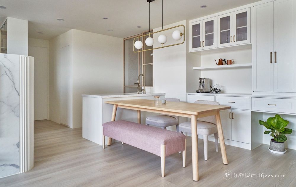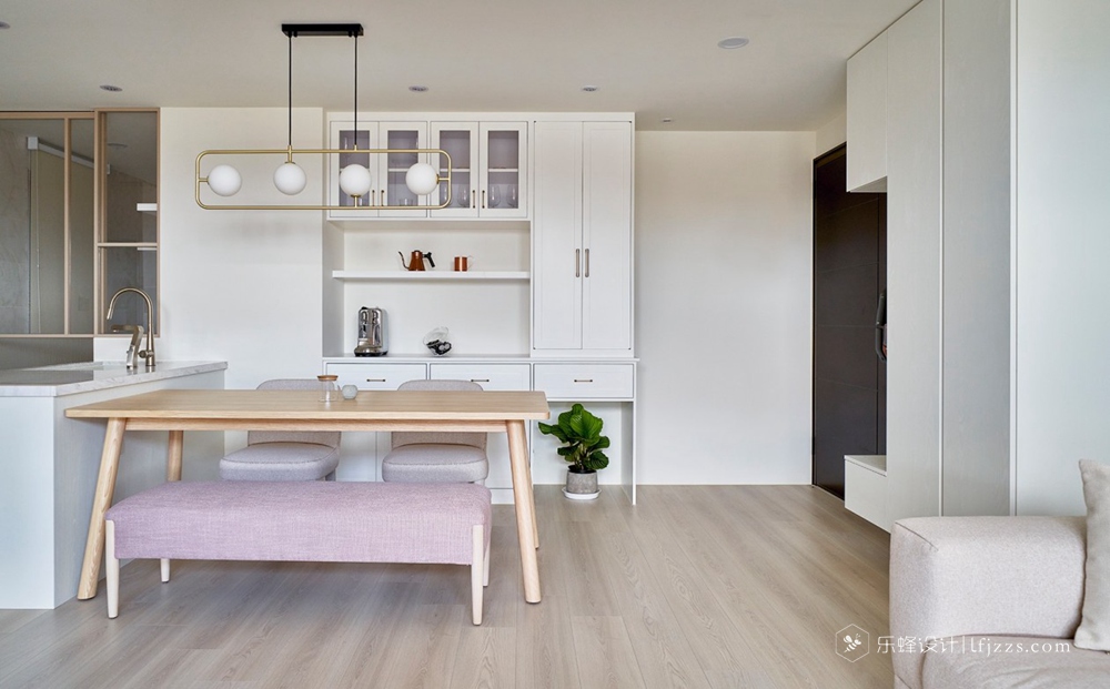 餐廳采用日式木色長桌,就算一家人或者朋友的偶聚也不會(huì)擔(dān)心坐不下,在餐桌的旁邊也做了一排的儲(chǔ)物柜,即美觀又更加了收納。