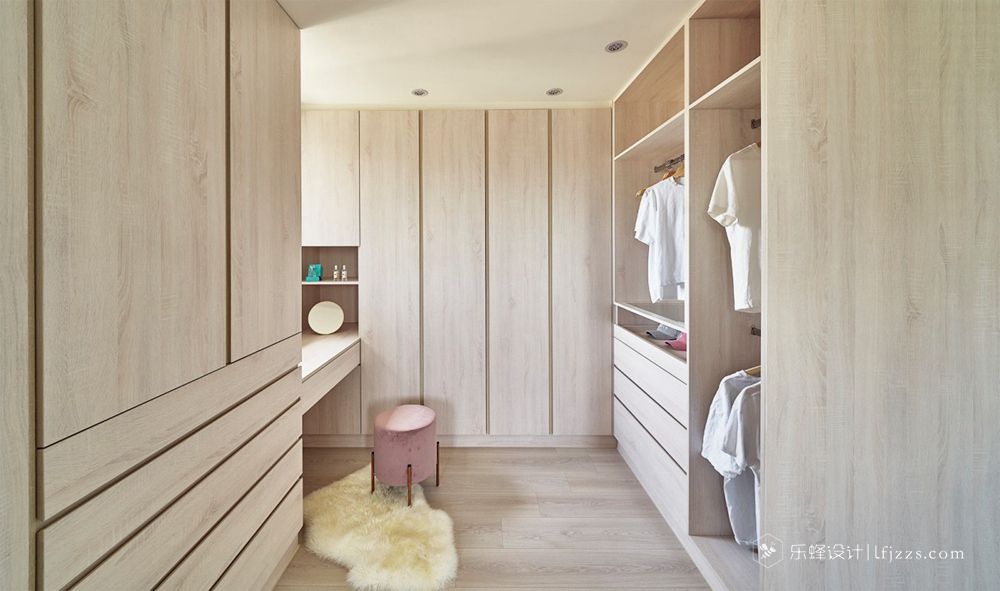 整個(gè)衣帽間都設(shè)計(jì)成一個(gè)大的收納空間,但是把女主人收拾的地方坐在窗邊,這樣光線是最好的,而且可以讓女主人感覺自己被包裹在她的所以衣物里面的那種滿足感。
