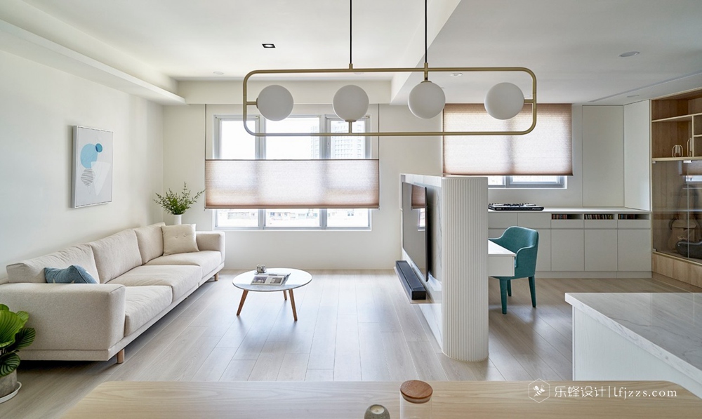 考慮到客廳的一個(gè)空間大小,男主人又需要一個(gè)可以平時(shí)用的書房,所以客廳劃分成兩個(gè)獨(dú)立的空間,中間就一堵電視背景墻隔斷,這樣顯得空間看起來比較寬闊,但空間每個(gè)該有的功能區(qū)都有,顯得還沒有那么雜亂。