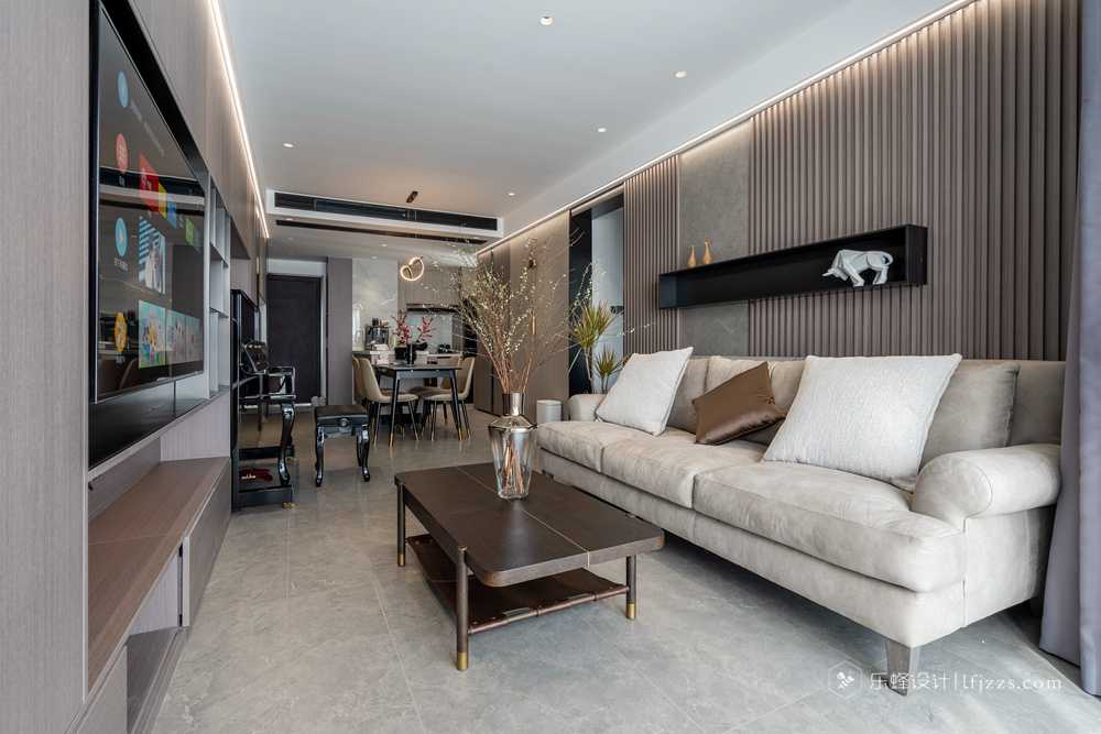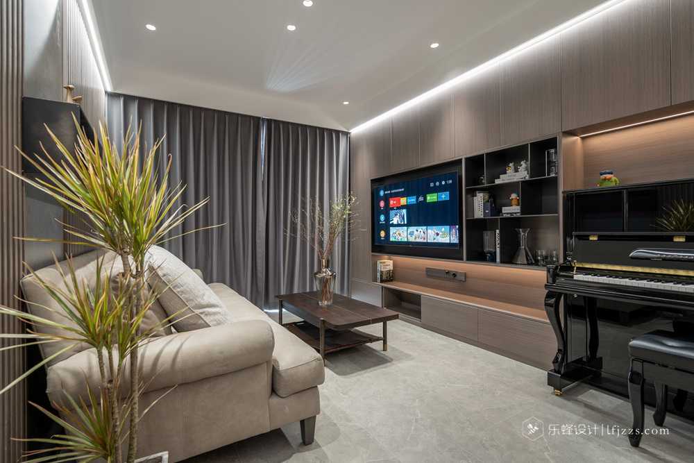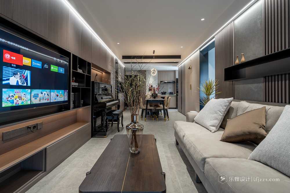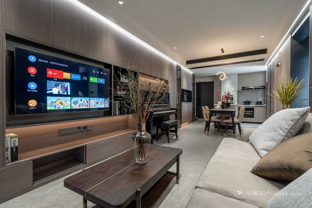 客廳采用開放式的設(shè)計(jì),基于收納需求的考量,電視背景墻以柜體的形式呈現(xiàn),強(qiáng)大的收納力征服全場(chǎng)。
