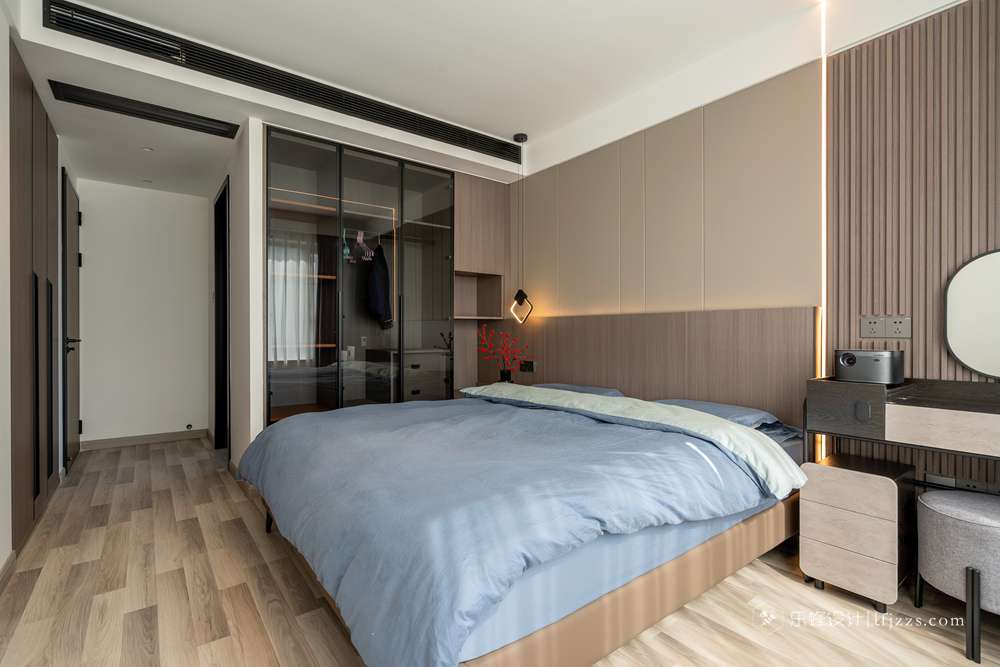 一側(cè)透明衣柜柜體與懸掛式床頭的搭配,生活休閑兩不誤。居住的舒適度也被無(wú)限放大,每一個(gè)角落都充滿著生活的愜意悠閑。