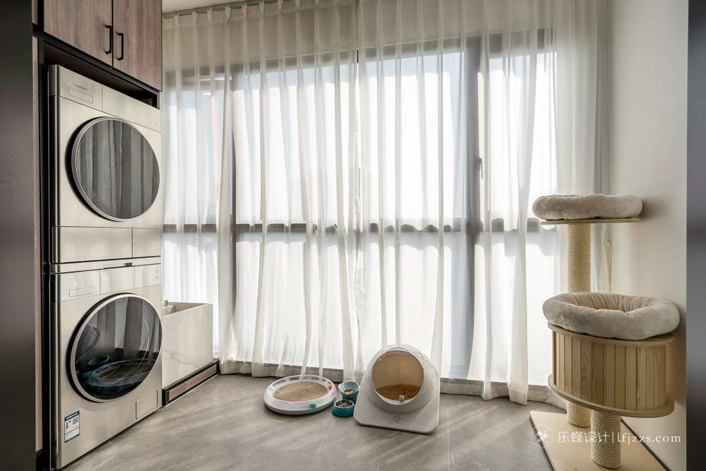把洗衣機(jī)鑲嵌在陽(yáng)臺(tái)的儲(chǔ)物柜里面,即不影響美觀又節(jié)省空間,把貓窩放在陽(yáng)臺(tái),配上白色窗簾,當(dāng)陽(yáng)光照耀到貓的身上,形成一幅美的風(fēng)景畫。