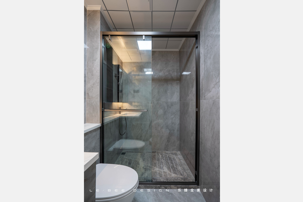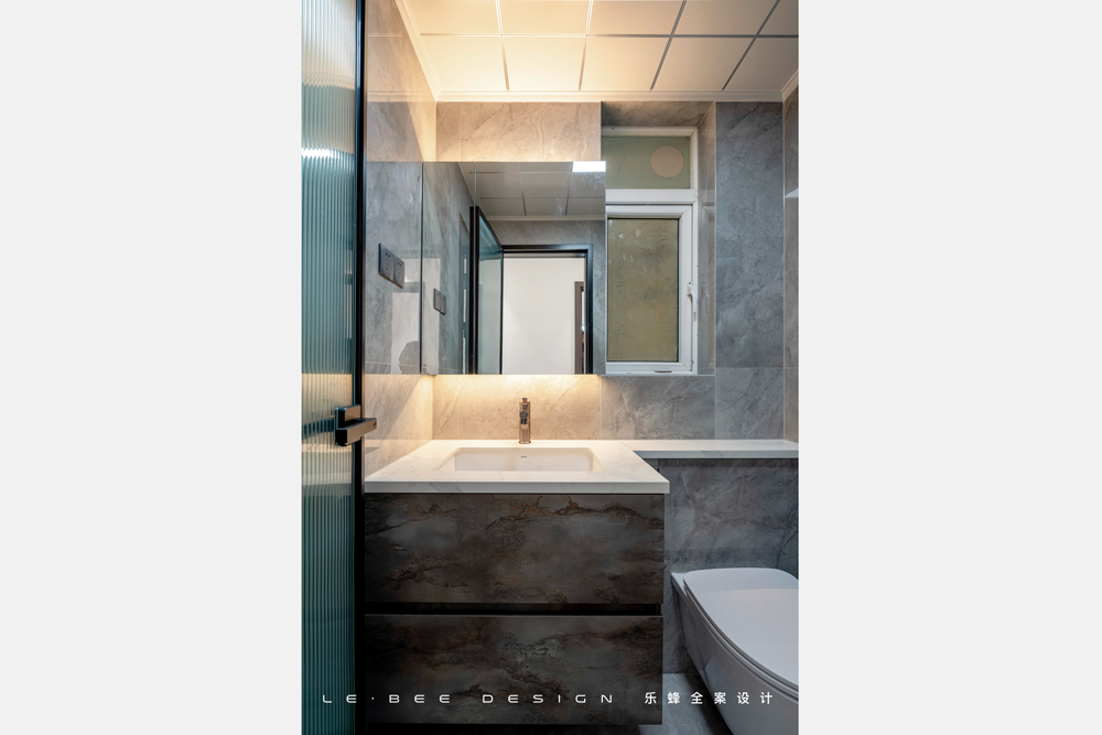 洗手間在鏡柜的上下方設(shè)置了燈帶,增加了空間的照明,馬桶區(qū)域通過浴室柜的延伸,有一定的儲物空間,淋浴區(qū)做干濕分離,方便打掃