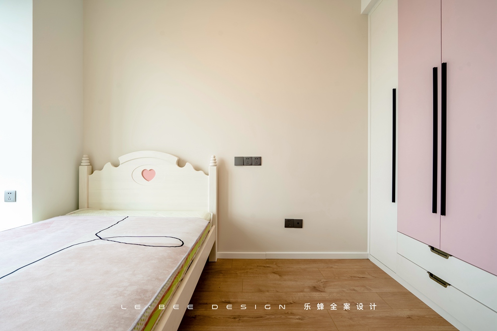目前配置簡單,把衣柜和床設(shè)置成女孩喜歡的粉色,后期再增加一個用來學(xué)習(xí)的書桌,整體也就成型了,墻面用米色的油漆來營造溫馨的氛圍