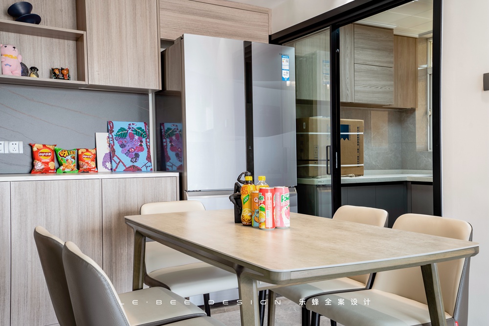 餐廳部分,將冰箱移至餐廳,釋放了廚房的空間,同時冰箱又跟餐邊柜結(jié)合在一起,中間放置餐桌,四周流動線,方便日常活動