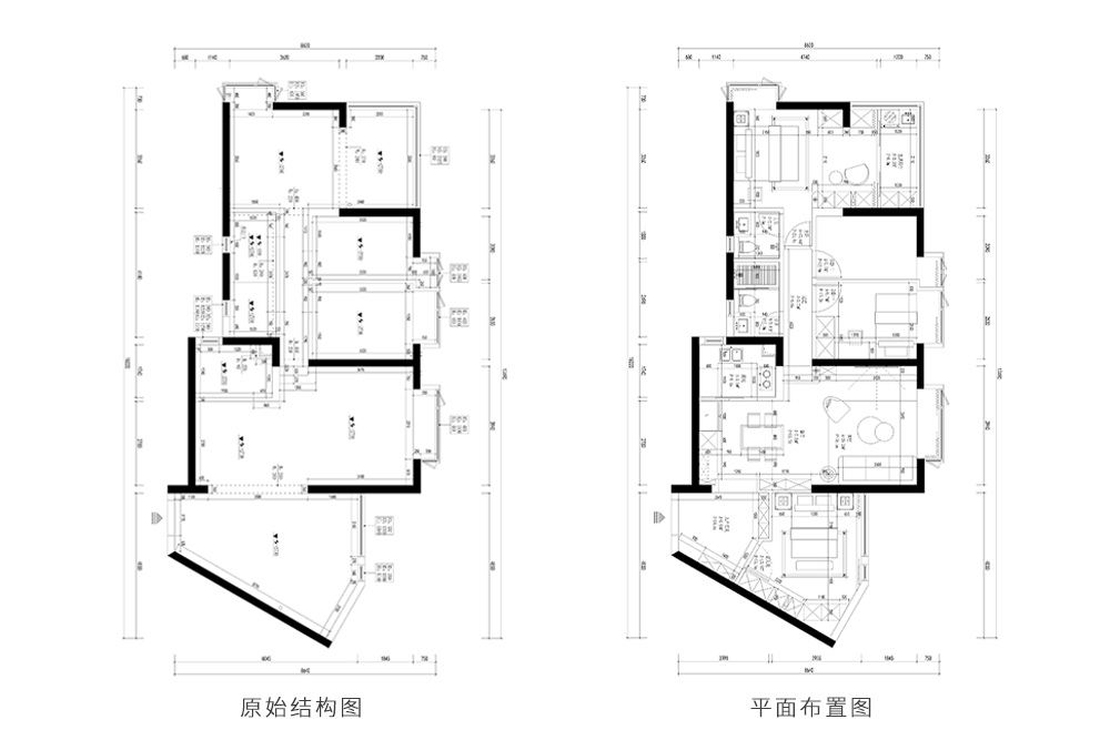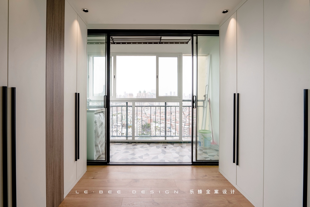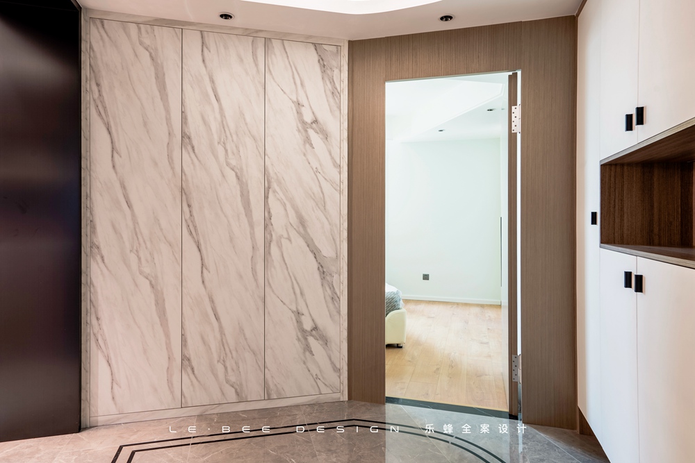 入戶對面不規(guī)則的房間,通過斜中取直的設(shè)計手法,將柜子內(nèi)嵌到空間里面,整體空間顯得更加規(guī)則