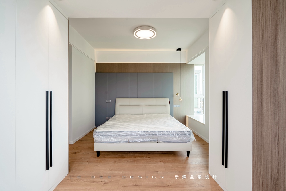 主臥分為三個區(qū)域,分為睡眠區(qū),衣帽區(qū)和外側(cè)的生活陽臺區(qū)域,吊頂在美化了,中央空調(diào)的同時也弱化了梁位的存在背景墻利用飾面板和燈帶,營造出良好的空間氛圍感