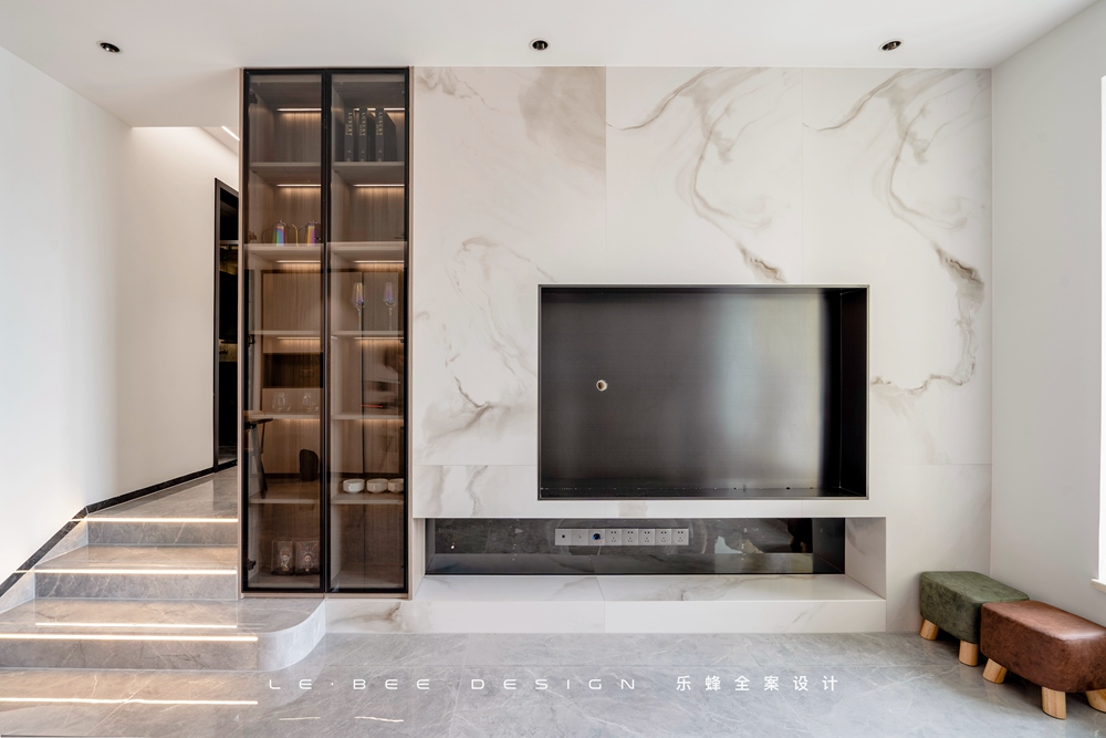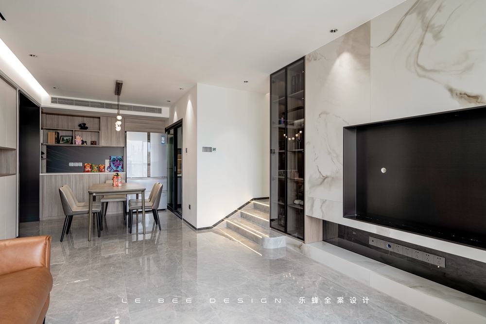 整體客廳是一個錯層的結(jié)構(gòu),將電視墻和做成的樓梯融合在一起,搭配了白色簡約的大理石和玻璃柜,門將電視的位置掏空,做不銹鋼材質(zhì),搭配整體的色調(diào),有一個黑白的對比,更加的簡約,同時做無主燈吊頂,用磁吸軌道燈搭配筒燈和燈帶,營造出整體的燈光氛圍