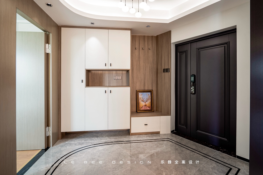 入戶門利用整體不規(guī)則的結(jié)構(gòu),做了一個雙波打線的設(shè)計,進(jìn)門旁邊的柜子做了合理的分區(qū)設(shè)置