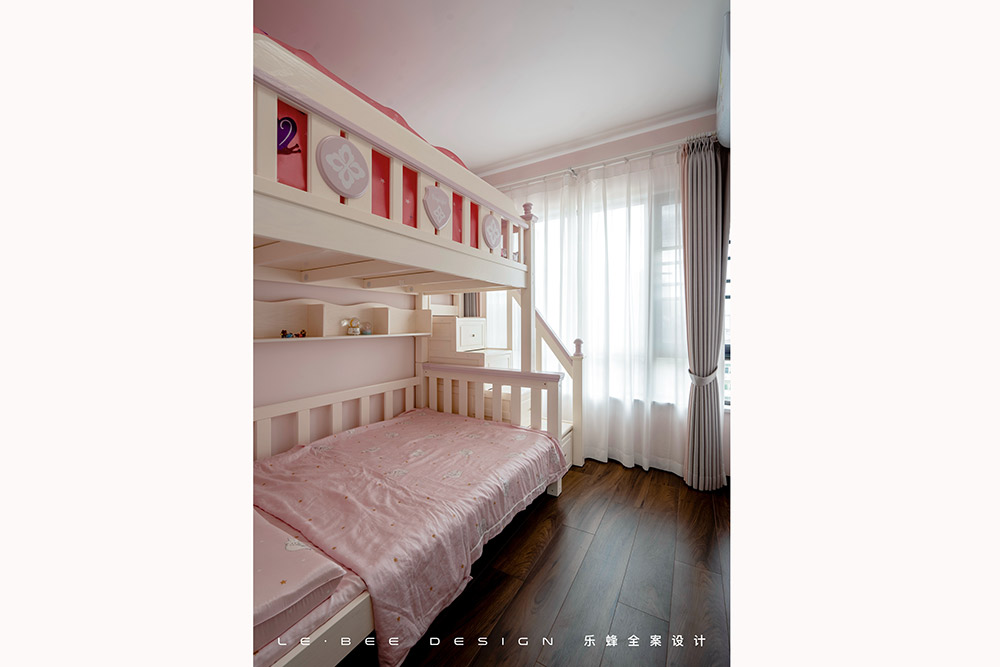 整個(gè)家里的房間都屬于南北朝向,特別是南向的主臥和兒童房,在采光通風(fēng)能得到保證的同時(shí)心情也會(huì)更加舒暢,粉色的上下床,在日常睡眠的同時(shí)也兼具了儲(chǔ)物的功能。