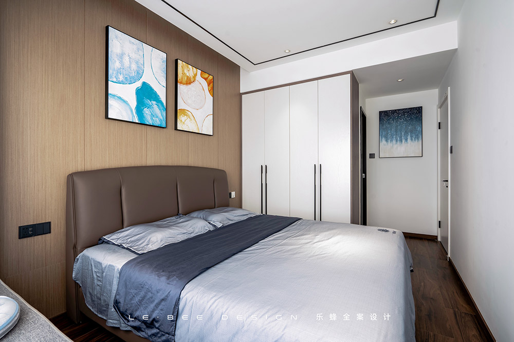 主臥的布置更偏向成熟,地面地板材質(zhì)和墻面飾面板的色調(diào)更加穩(wěn)重,組合出一個(gè)格調(diào)雅致的主臥空間,柔和雅致的色調(diào)有助于平復(fù)人的心緒。吊頂做無(wú)主燈設(shè)計(jì),頂面的防眩筒燈結(jié)合燈帶的照明效果能很好覆蓋到房間的每一個(gè)角落,讓主臥的光照更加均勻,通過(guò)頂面梁體的高低落差同樣也制造出高低落差的層次感,