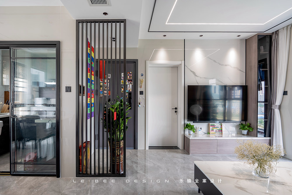 入戶區(qū)域通過(guò)增加玄關(guān)隔斷的方式來(lái)解決入戶門正對(duì)著主臥門的不適感,門后的照片粘貼區(qū)增加日常的溫馨感,讓空間和人更加有親密感,這里要特別提一下,我們把鞋柜設(shè)計(jì)放在了大門外的空間,保持了玄關(guān)和客餐廳的整潔。
