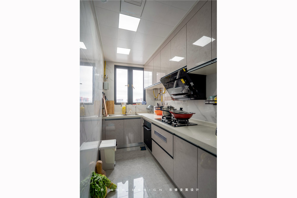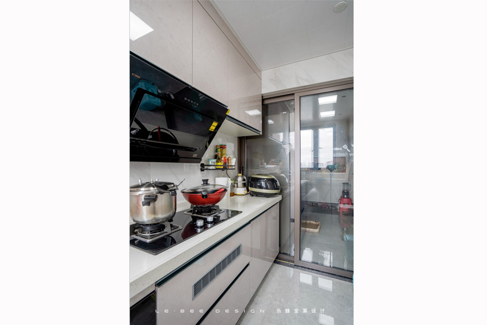 入戶門的左邊為廚房,L型櫥柜和頂柜,沒有死角增加收納空間,微晶板做櫥柜門,不僅簡潔好看還方便打理。