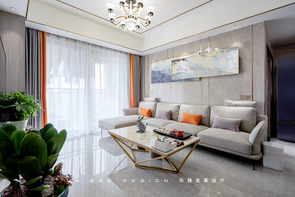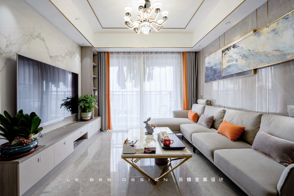 整體的灰色家具里點(diǎn)綴橙色小品,讓整個(gè)空間跳躍起來,使房間變得有溫度顯得更溫馨,電視柜上擺放著的綠植給整個(gè)空間增添一絲活力。