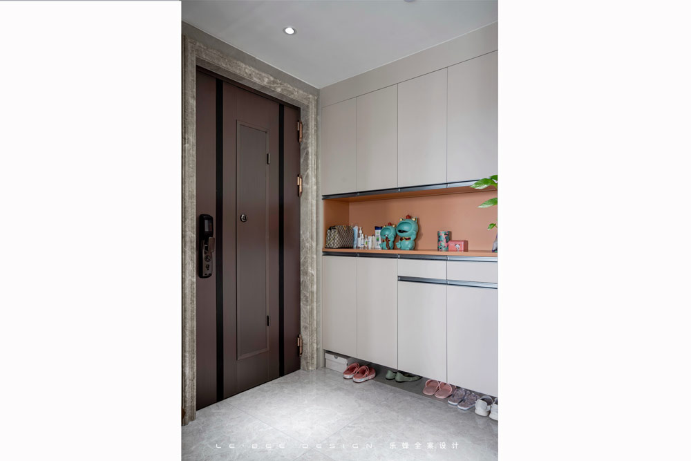 本戶走廊型玄關(guān),在進(jìn)門處預(yù)留一段類似走廊的過渡區(qū),避免了進(jìn)門一覽無余的尷尬,利用了過道空間將鞋柜嵌入墻內(nèi)打造I型玄關(guān)柜,儲(chǔ)物力滿滿,設(shè)計(jì)底部留空區(qū),可以放一家每日進(jìn)出門的鞋,規(guī)整又好打理。