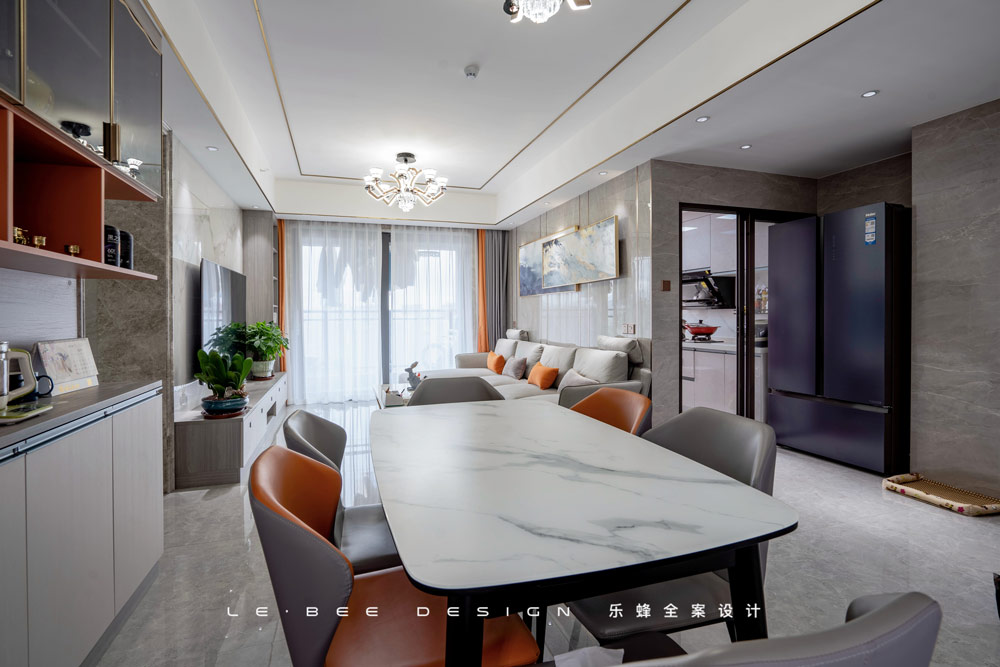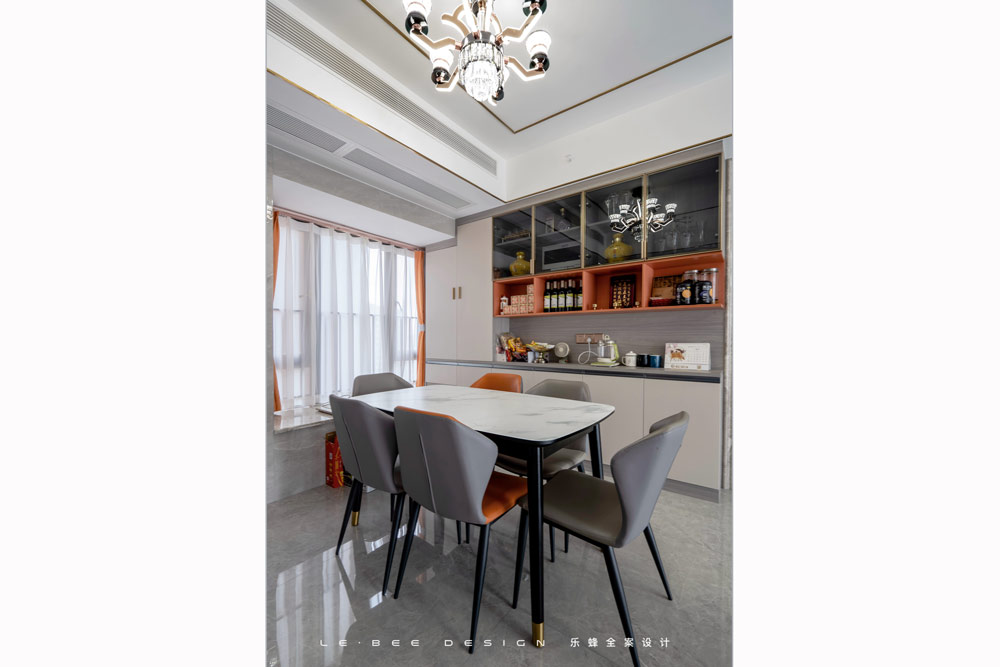 餐廳的墻面做了一整面餐邊柜,增加了收納空間。大理石的餐桌方便打理,灰色、橙色的餐椅與整個(gè)空間相呼應(yīng),使整個(gè)空間顯得不沉悶而又高級(jí)。