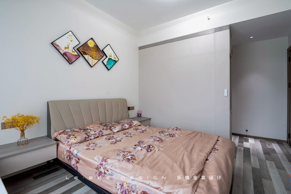主臥就是簡約裝修,還是以灰色為主,華而不奢,奢而不華。多色拼接地板,使房間不沉悶,纖細(xì)的床架也顯得輕盈,讓房間的視覺效果增大。