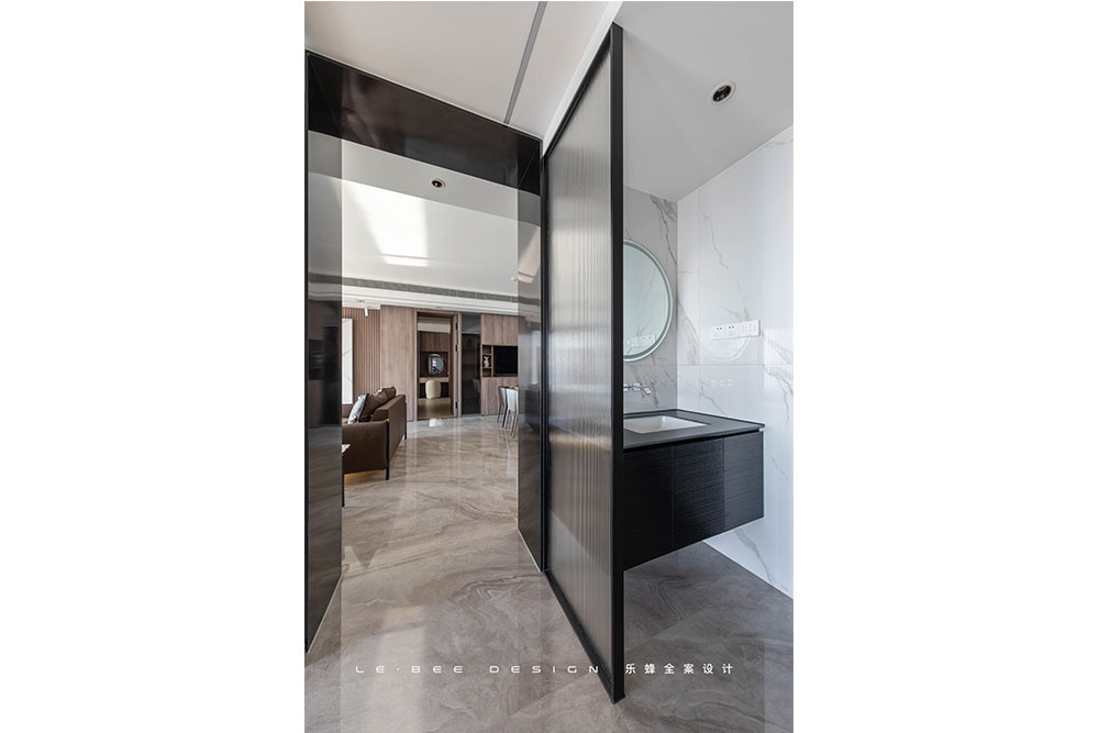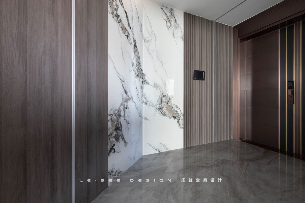 運(yùn)用木格柵、大理石面板、木飾面板對(duì)墻面進(jìn)行三分設(shè)計(jì),奶白的大理石瓷磚和深褐的木質(zhì)面板,顏色和材質(zhì)的相互碰撞,空間的舒張、視覺的沖擊無限擴(kuò)張。