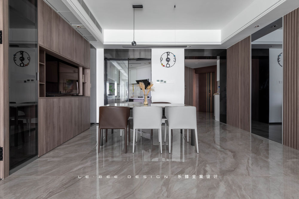 餐廳側(cè)面是一整面餐邊柜的設(shè)計(jì),內(nèi)嵌電視,邊吃飯邊追劇的愿望輕松實(shí)現(xiàn),開放式展示柜和暗色玻璃柜門明暗交錯(cuò),隱私性和裝飾性配合完美。