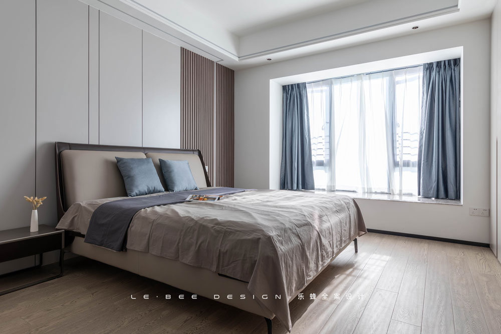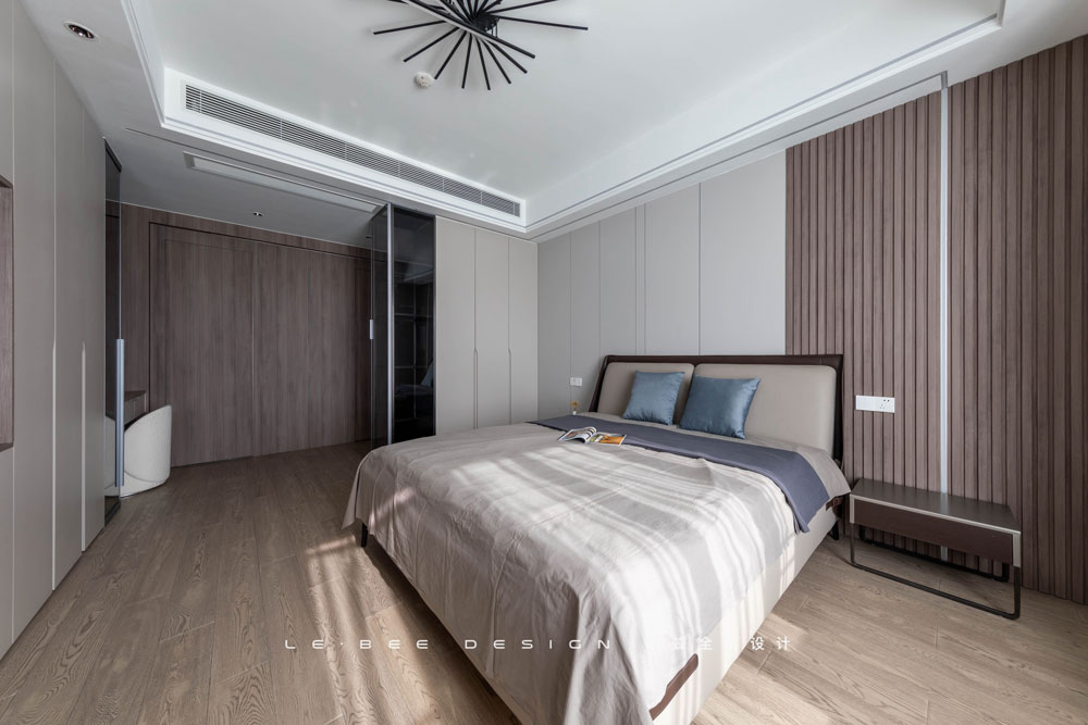 主臥給人的視覺感官倍感舒適,因?yàn)榇竺娣e的木質(zhì)墻面和木地板相連,視覺無過度,順滑無比。