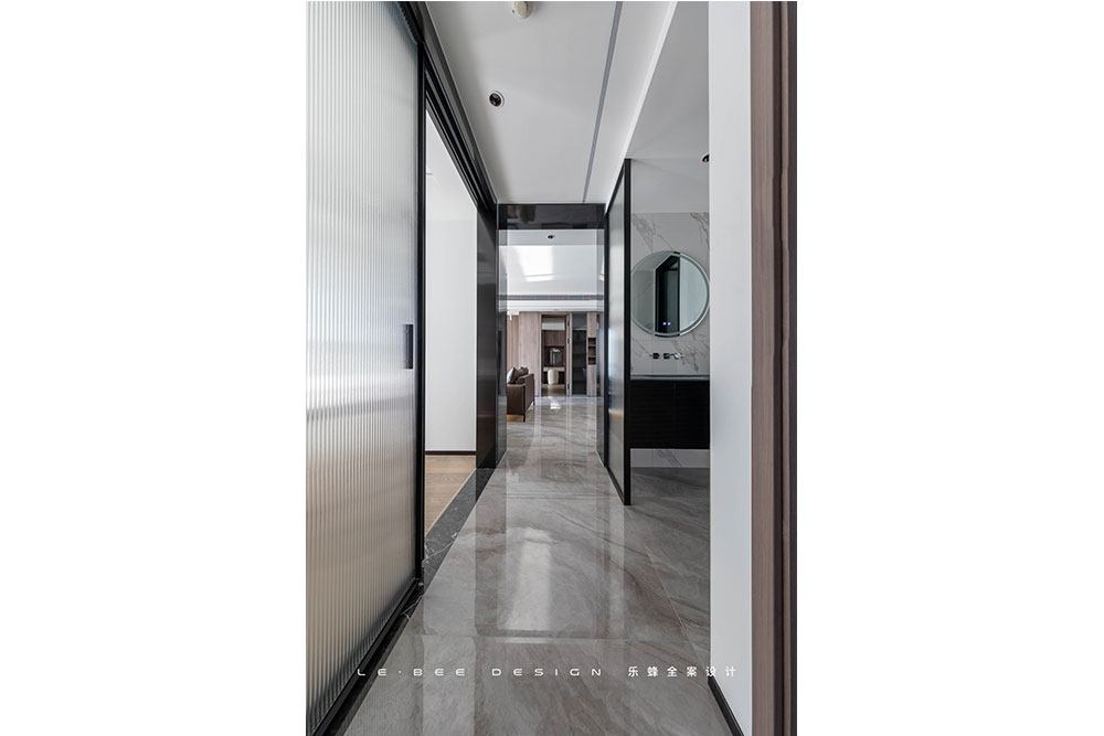 書房不屬于私人區(qū)域,因此在隱私方面沒有很高的要求,書房隔斷選用長虹玻璃推拉門,做到了透光和空間隔斷兼?zhèn)?,推拉門選用上滑軌,減少了地面清潔打掃的壓力,也保證了目之所及之處的整潔如一。