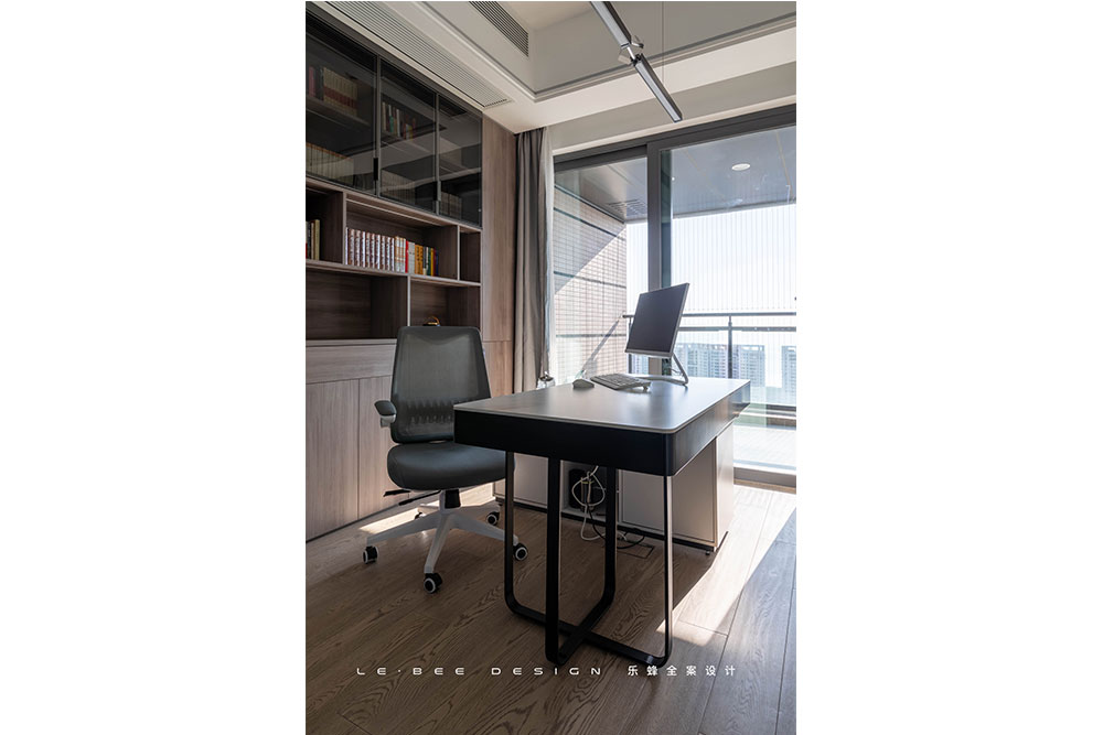 書房外是陽臺(tái),落地窗使自然光毫無阻礙地注入,為工作和學(xué)習(xí)提供了不二的處所。