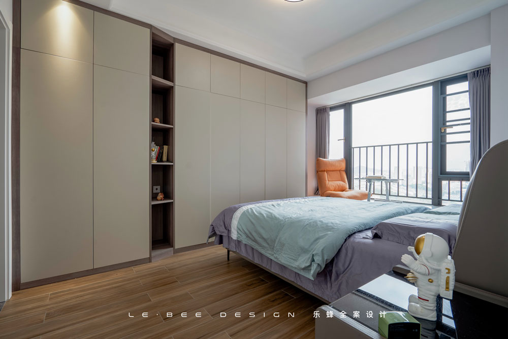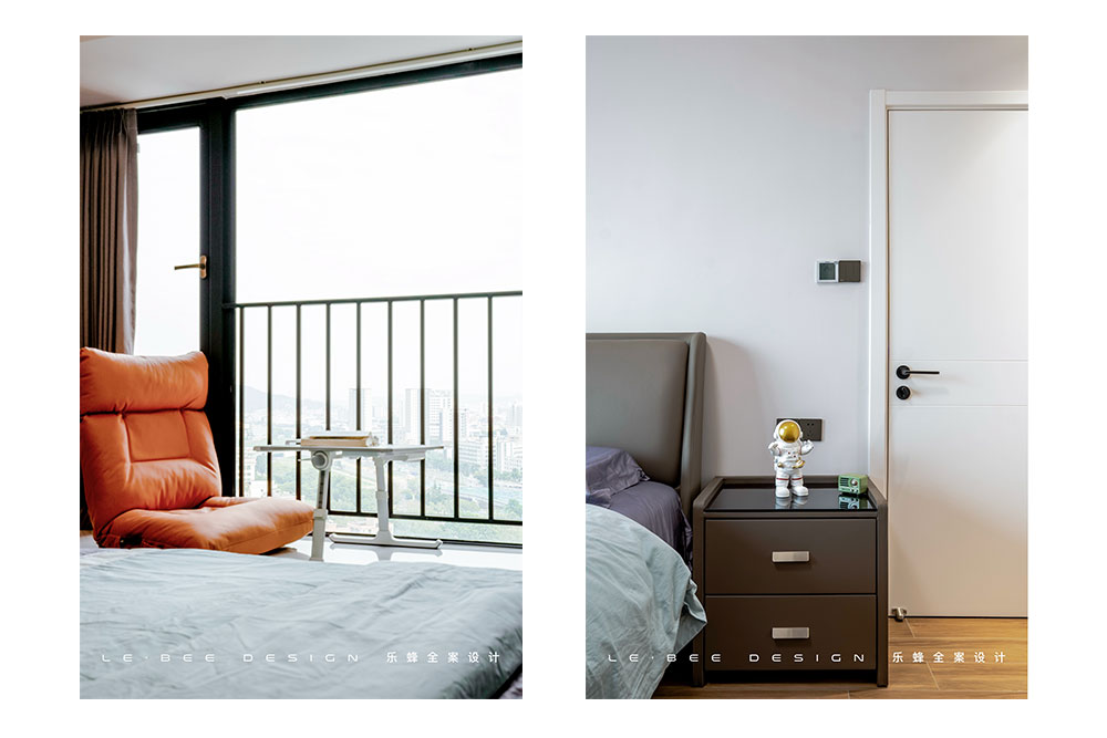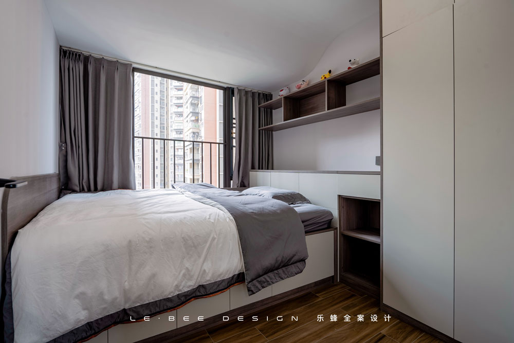 主臥在設(shè)計中更加強調(diào)儲物的充足和視覺空間的開闊,所以將床頭方向調(diào)轉(zhuǎn)到進門一側(cè)。