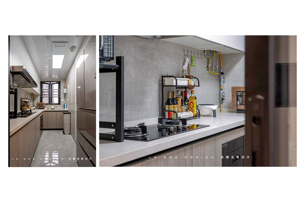 廚房在設(shè)計上完成了屋主想要在廚房里放冰箱的想法,我們在右側(cè)冰箱的位置做了墻體的折角,將冰箱嵌入進去,同時也確保了空間的方正。