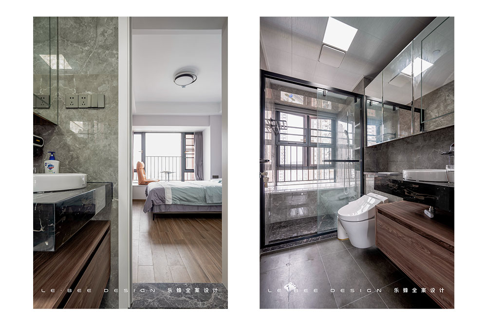 主臥配置的衛(wèi)生間采用了浴室柜和馬桶整體都抬高的設(shè)計,在日常打掃的時候不會有衛(wèi)生死角,同時淋浴區(qū)地面的大理石做了防滑的拉槽處理,更加安全。