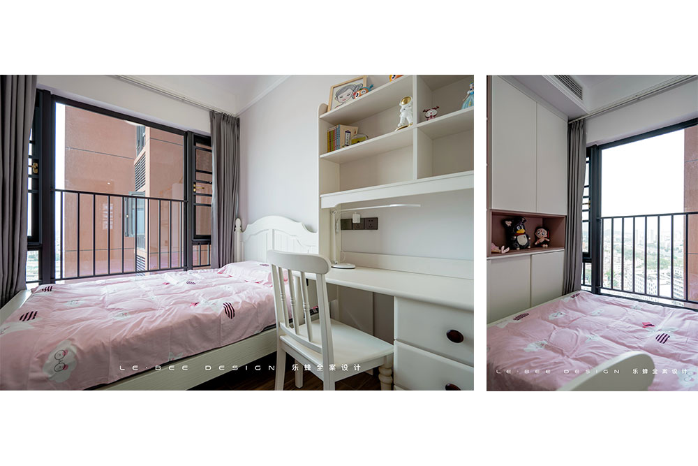 兒童房就是小女孩的活動天地啦,淺色的家具在視覺上比較緩和,粉色的床品作為點綴,陪伴孩子成長的童年。