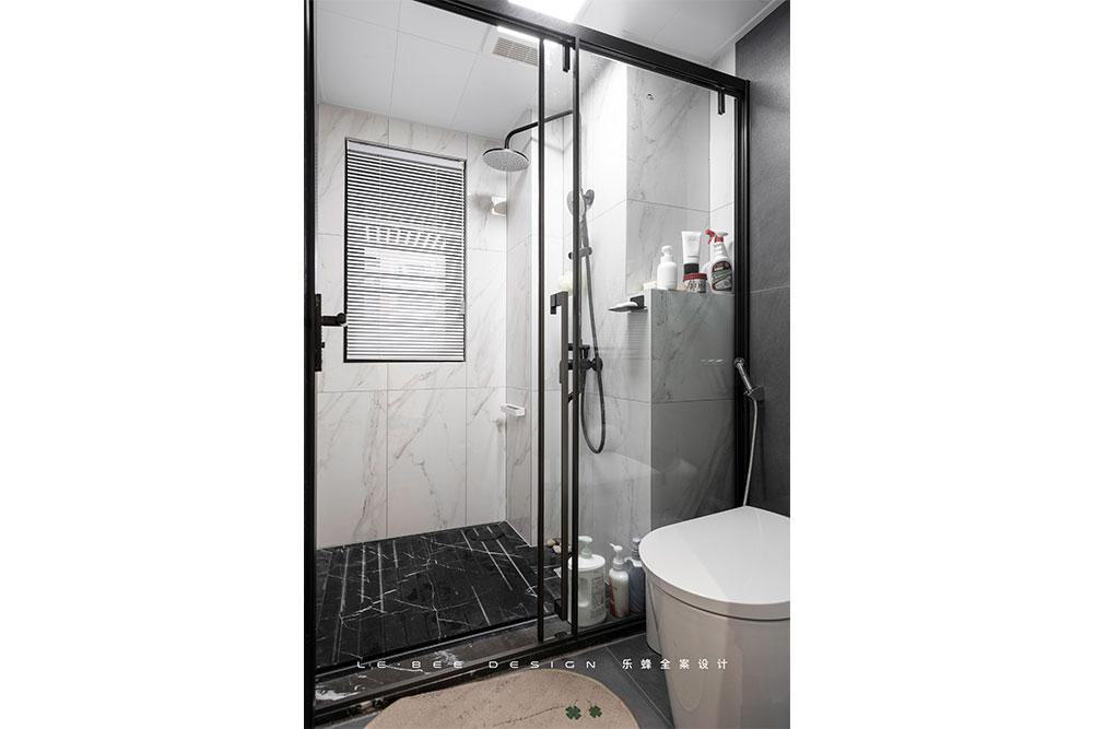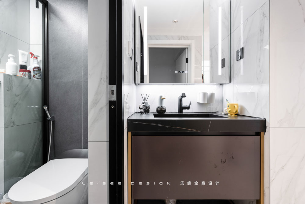 三分設(shè)計的衛(wèi)生間,既做到了干濕分離,又能滿足多人同時使用。洗手臺外置設(shè)計減輕了衛(wèi)生間內(nèi)部的空間壓力,黑色巖板臺面搭配白色瓷磚,經(jīng)典配色永遠(yuǎn)不會出錯。